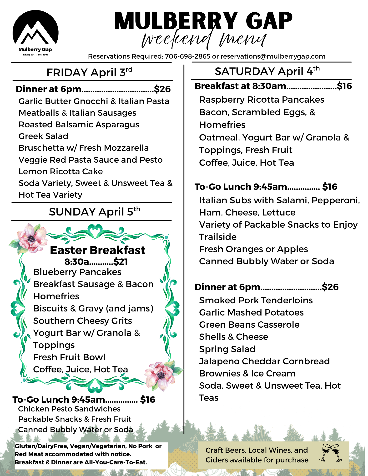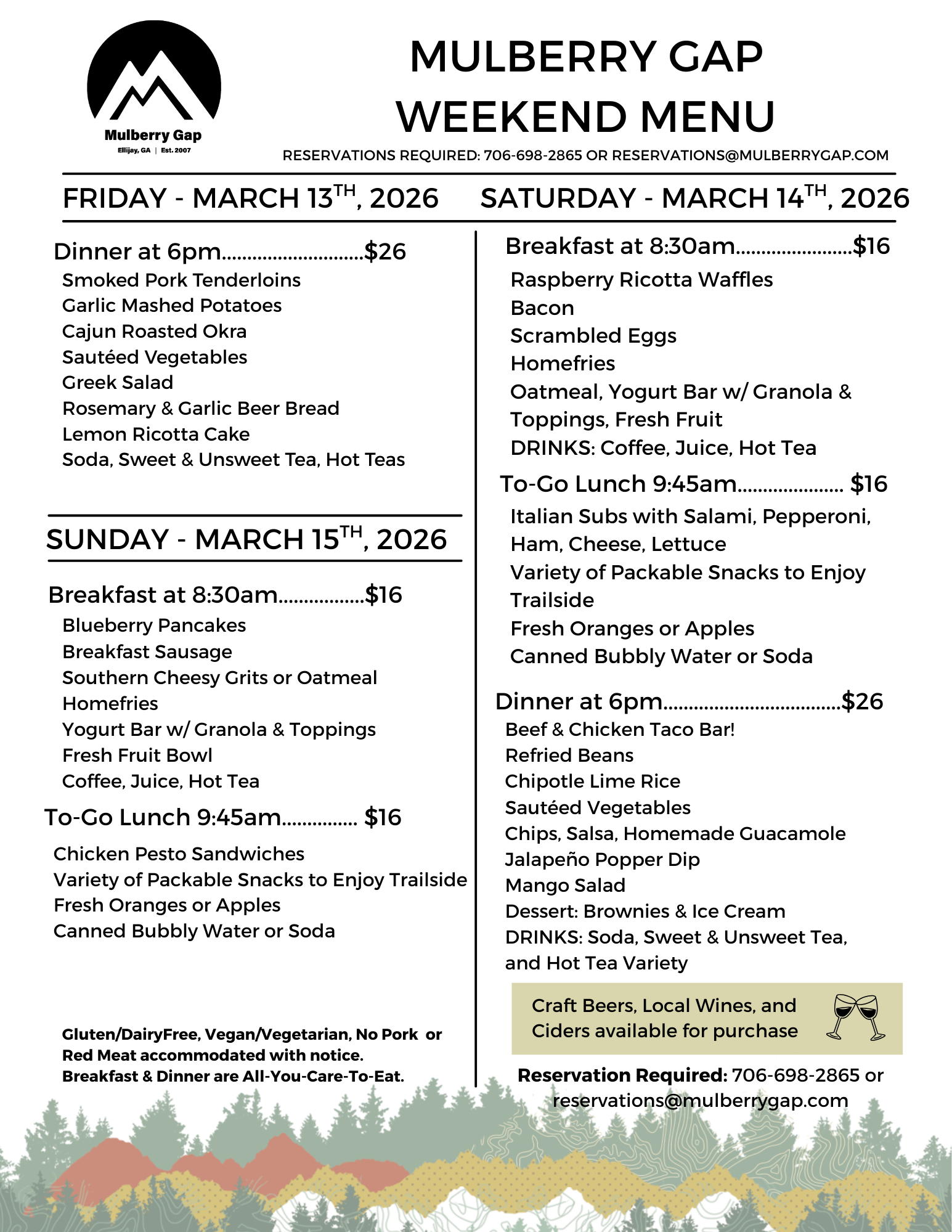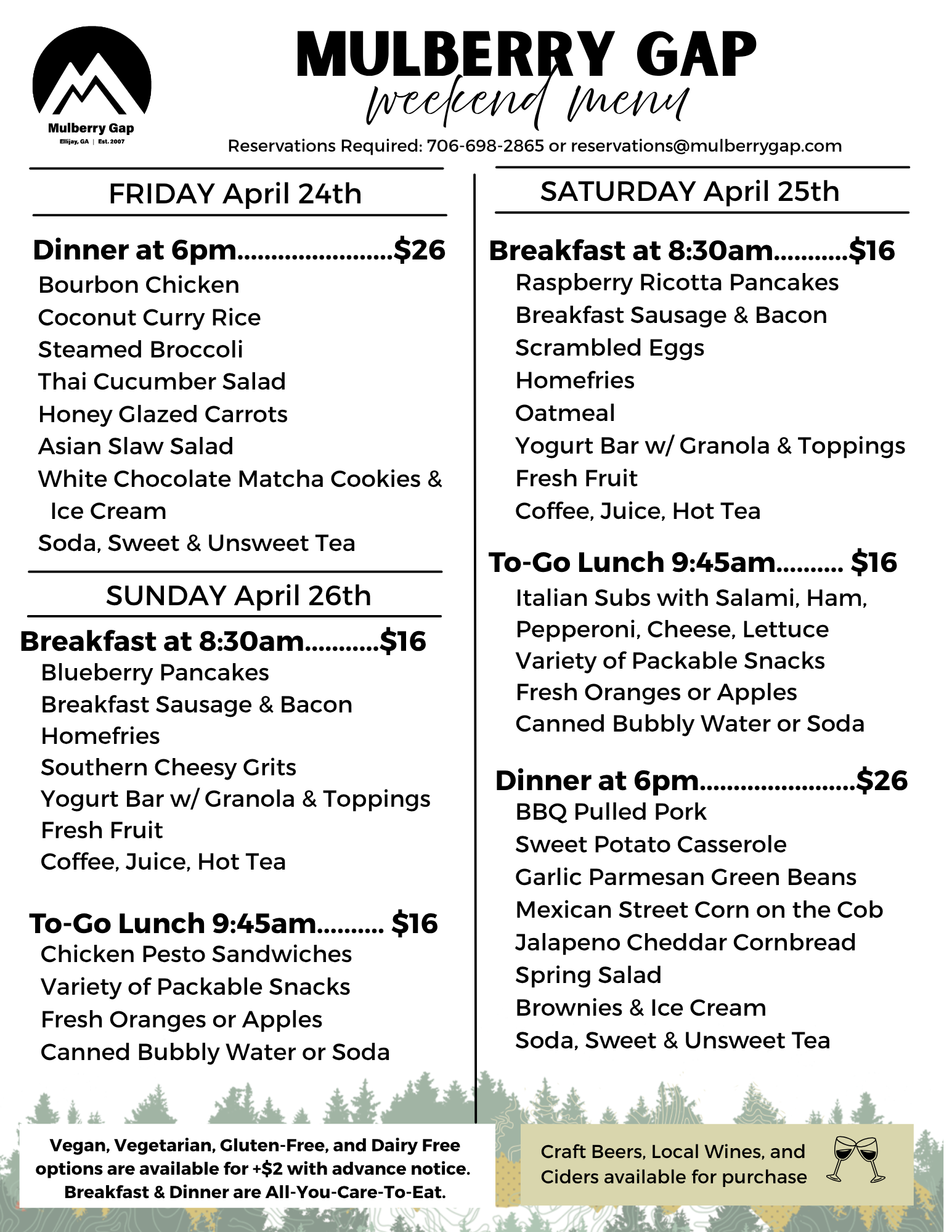 In 2026, we’ve schedule a handful of “No-Dinner Weekends” (dates coming soon). You are welcome to bring your own food, or check out one of the many great restaurants in NEARBY ELLIJAY as an alternative!