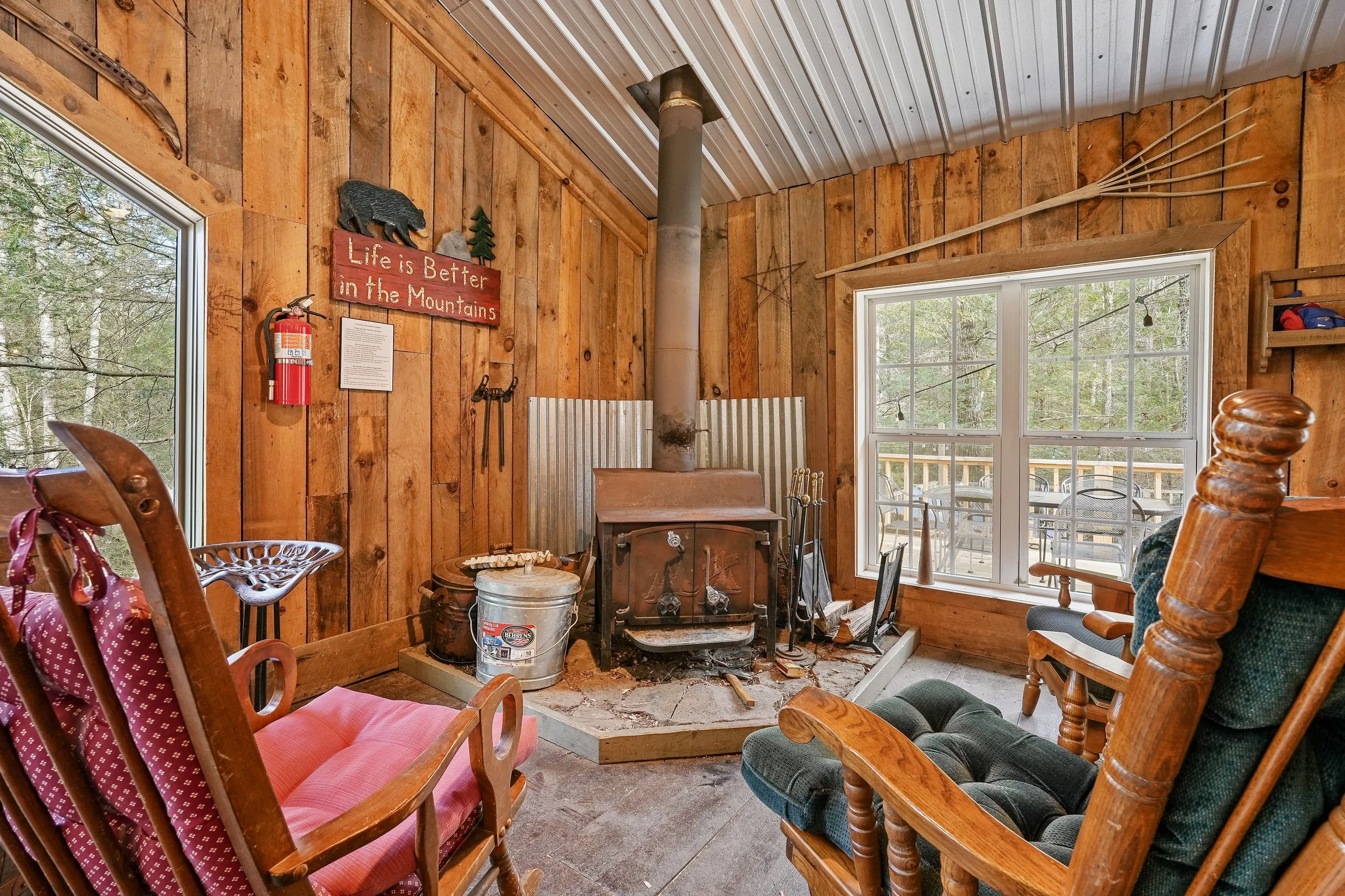 Exterior rustic tables & chairs on attached deck for up to 26 guests